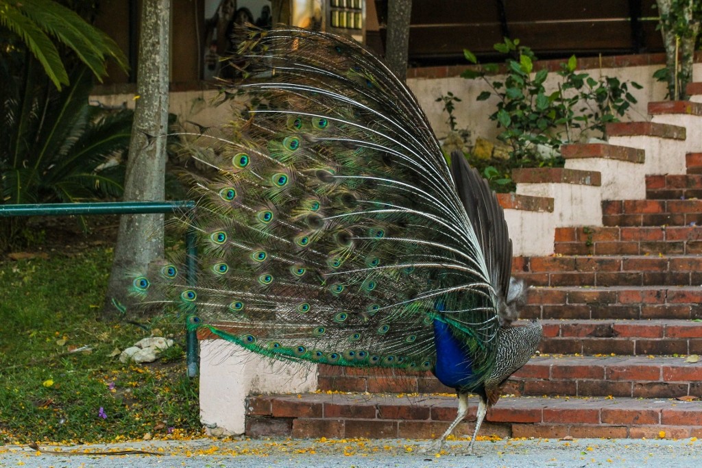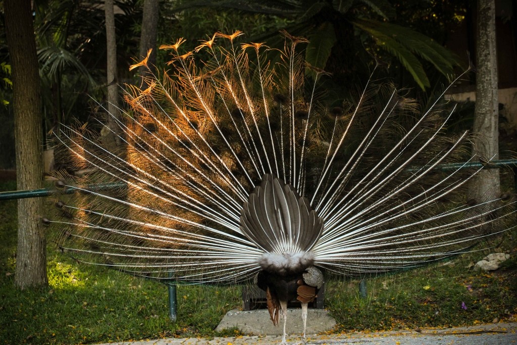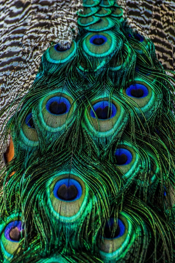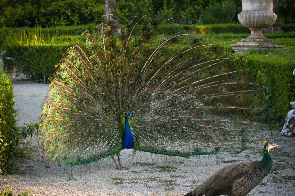 De facto, quando estão a pavonear-se, os machos abanam o leque de um lado para o outro. A verdade é que as cores das penas deve-se mais à arquitectura do que aos pigmentos, o que também acontece com penas e asas de outros animais (nomeadamente em borboletas e quando se trata da cor azul ‒ este vídeo é muito interessante).![]()