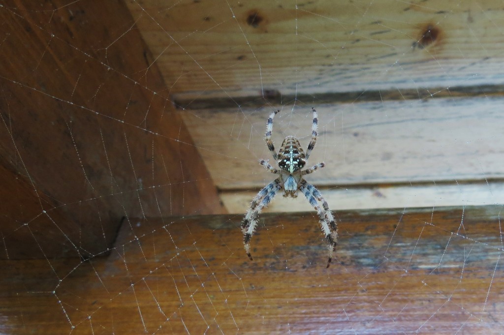 Ontem vi uma Araneus diadematus. Esta aranha tem uma característica que salta à vista: uma cruz branca no abdómen, formada por quatro manchas alongadas e uma mancha redonda central. A cruz reflecte-se em alguns nomes comuns da espécie, mas há outros: aranha-de-cruz, aranha-diadema, aranha-dos-jardins, epeira-de-cruz, epeira-dos-jardins, tecedeira-de-cruz-cosmopolita.