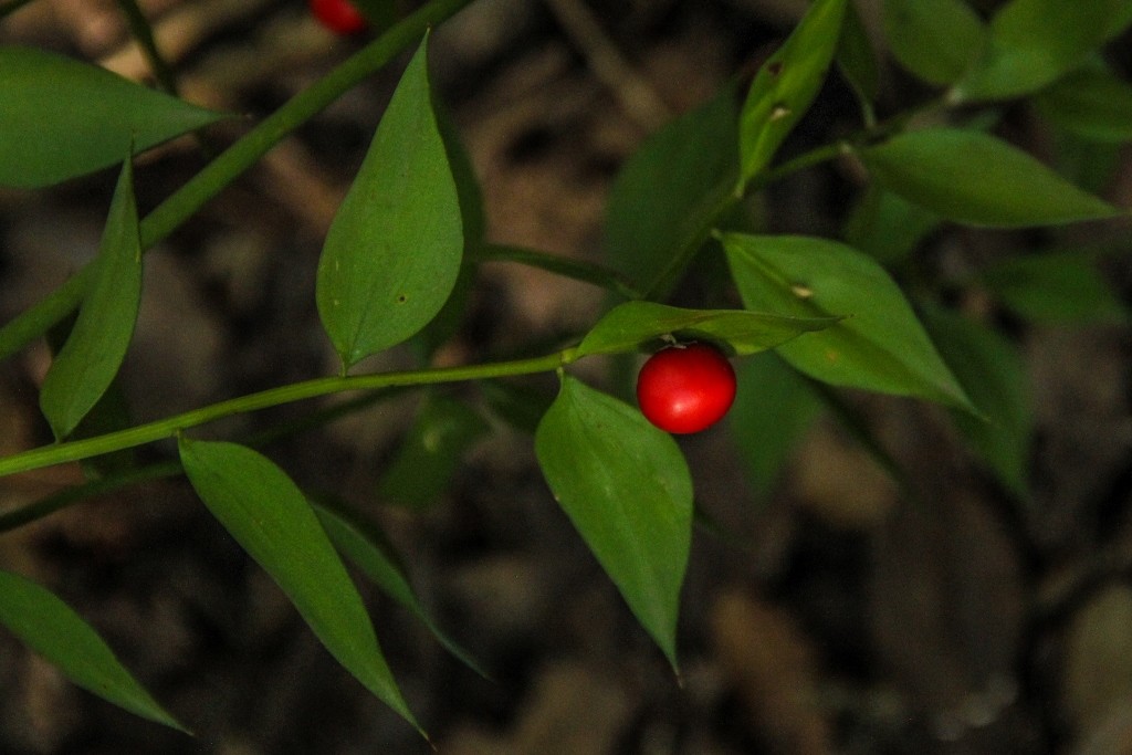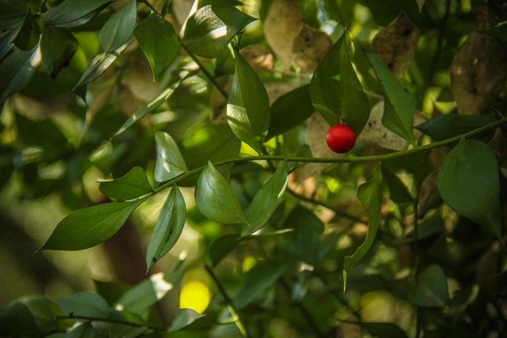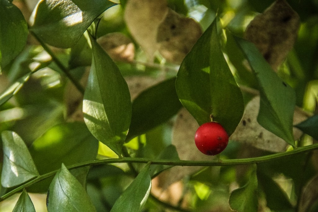 Por esta altura (Outono/Inverno) surgem os frutos, vermelhos, esféricos, com 10 a 12 mm de diâmetro (se olhar com atenção verá que o fruto "sai" da "folha"). Cada fruto contém duas sementes, que são depois dispersas através dos dejectos das aves que se alimentam dos frutos.