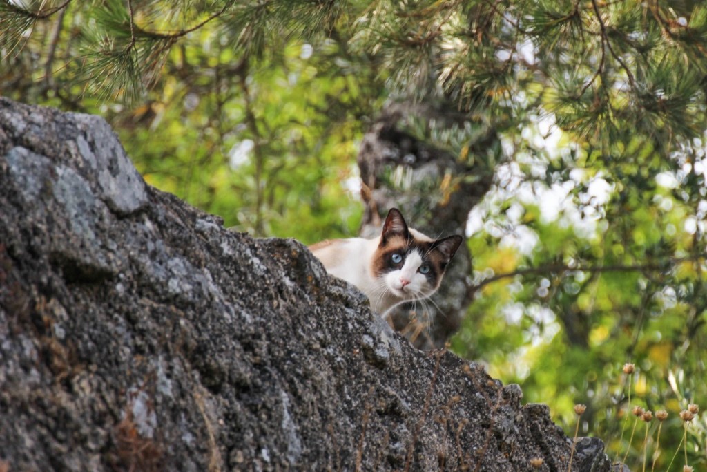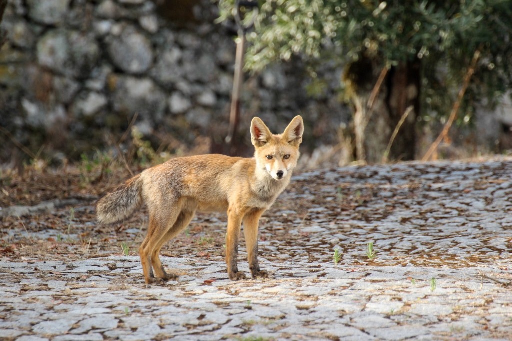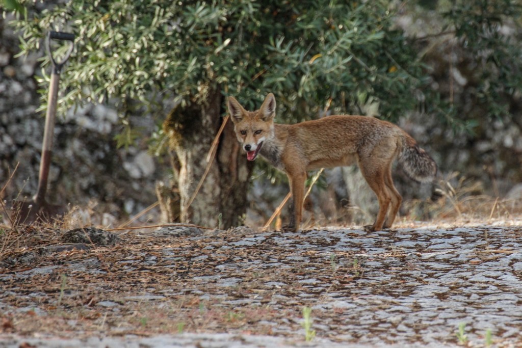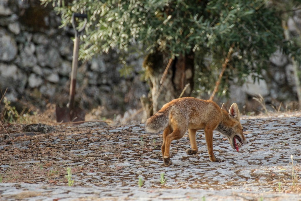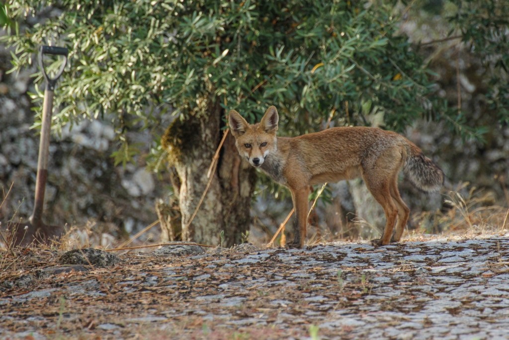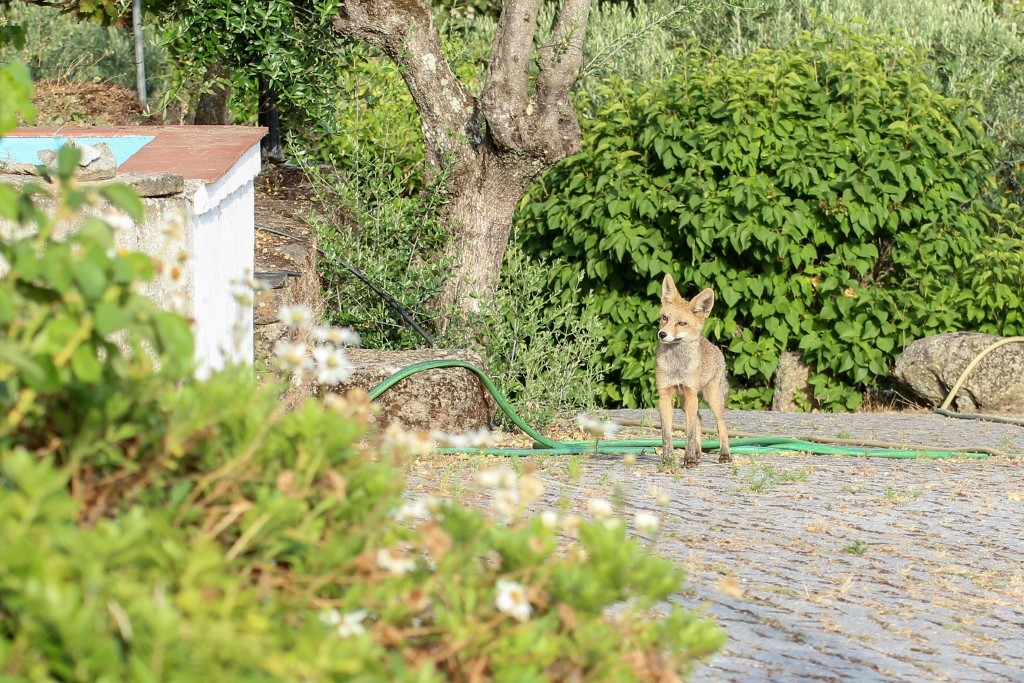 No dia seguinte, pela manhã, estava sentado no mesmo sítio quando a raposa (Vulpes vulpes) reapareceu, vinda do sítio onde desaparecera no dia anterior. Desta vez estava mais perto, viu-me, parou e sentou-se. Fui buscar a câmara fotográfica, mas a bicha já lá não estava. Encontrei-a uns metros mais à frente, a dar a volta à outra casa da propriedade, provavelmente em busca de alimento. Deve fazê-lo com frequência, pois os gatos da casa pareciam mais surpreendidos com a minha presença do que com a dela.