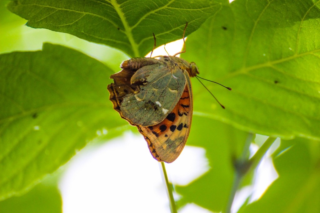 A parte inferior das asas é uma mescla de cores: pintas pretas, vermelho, amarelo, laranja e verde nas asas da frente; verde metalizado com riscas brancas nas de trás.