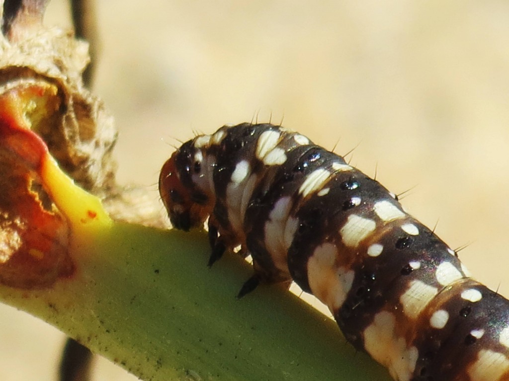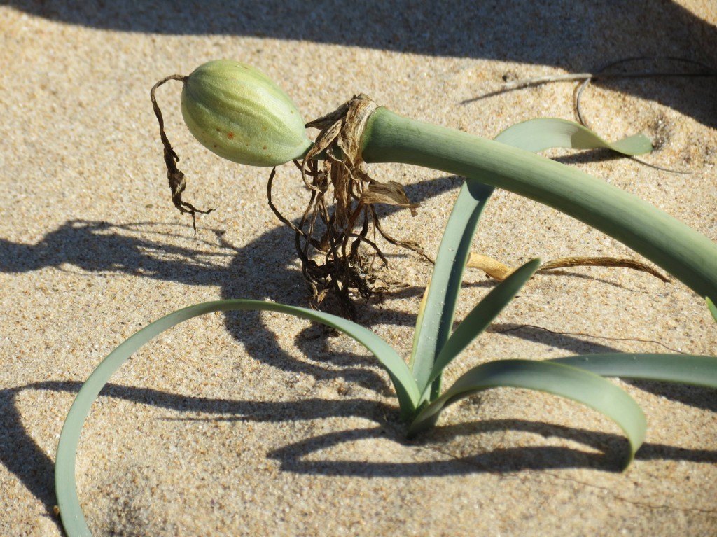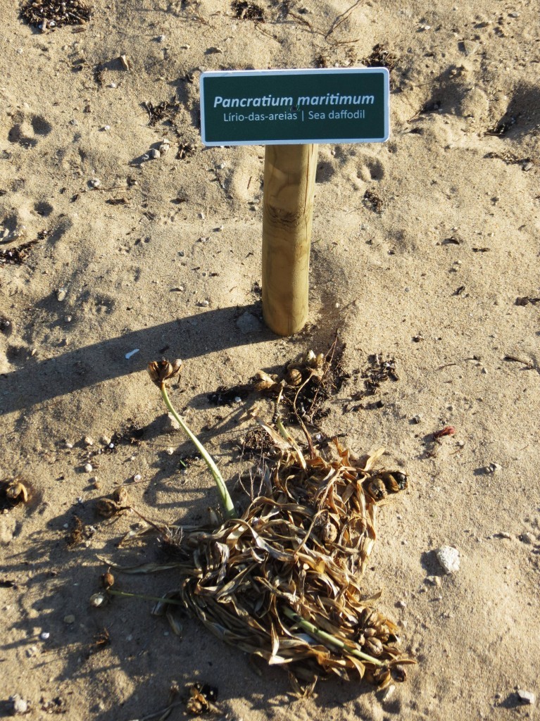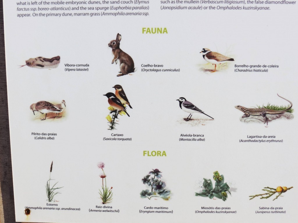 Dos coelhos só vi as latrinas, e da víbora-cornuda apenas o graffiti (há vários a assinalar a presença de diferentes espécies),mas cruzei-me com várias aves (toutinegra-de-cabeça-preta, rola-comum, fuínha-dos-juncos, rabirruivo-preto, chasco-cinzento) e insectos, como a borboleta-cauda-de-andorinha e a lagarta da borboleta nocturna Brithys crini (família Noctuidae), típica de zonas dunares, que se alimenta de lírio-das-areias.Brythis crini