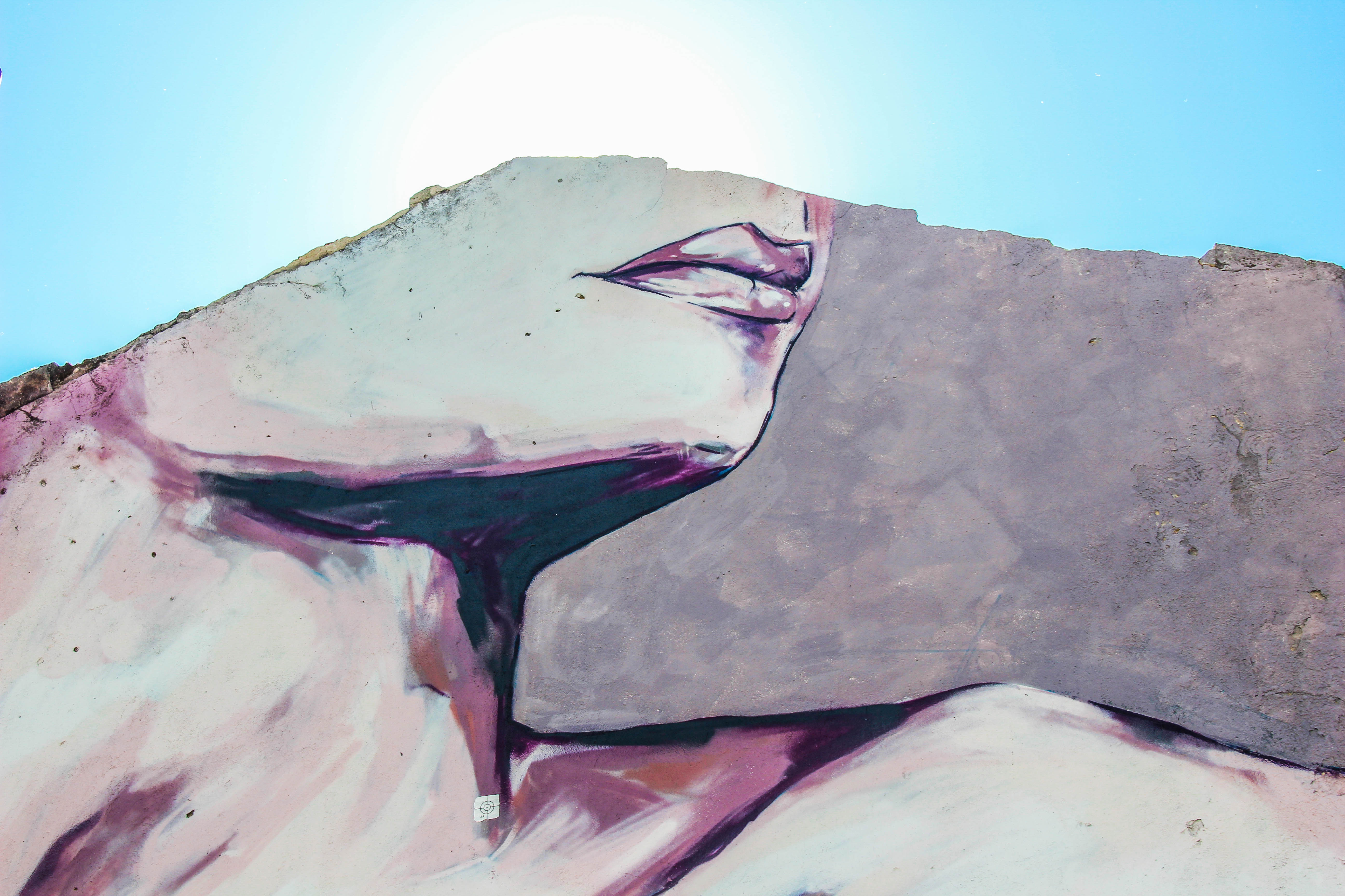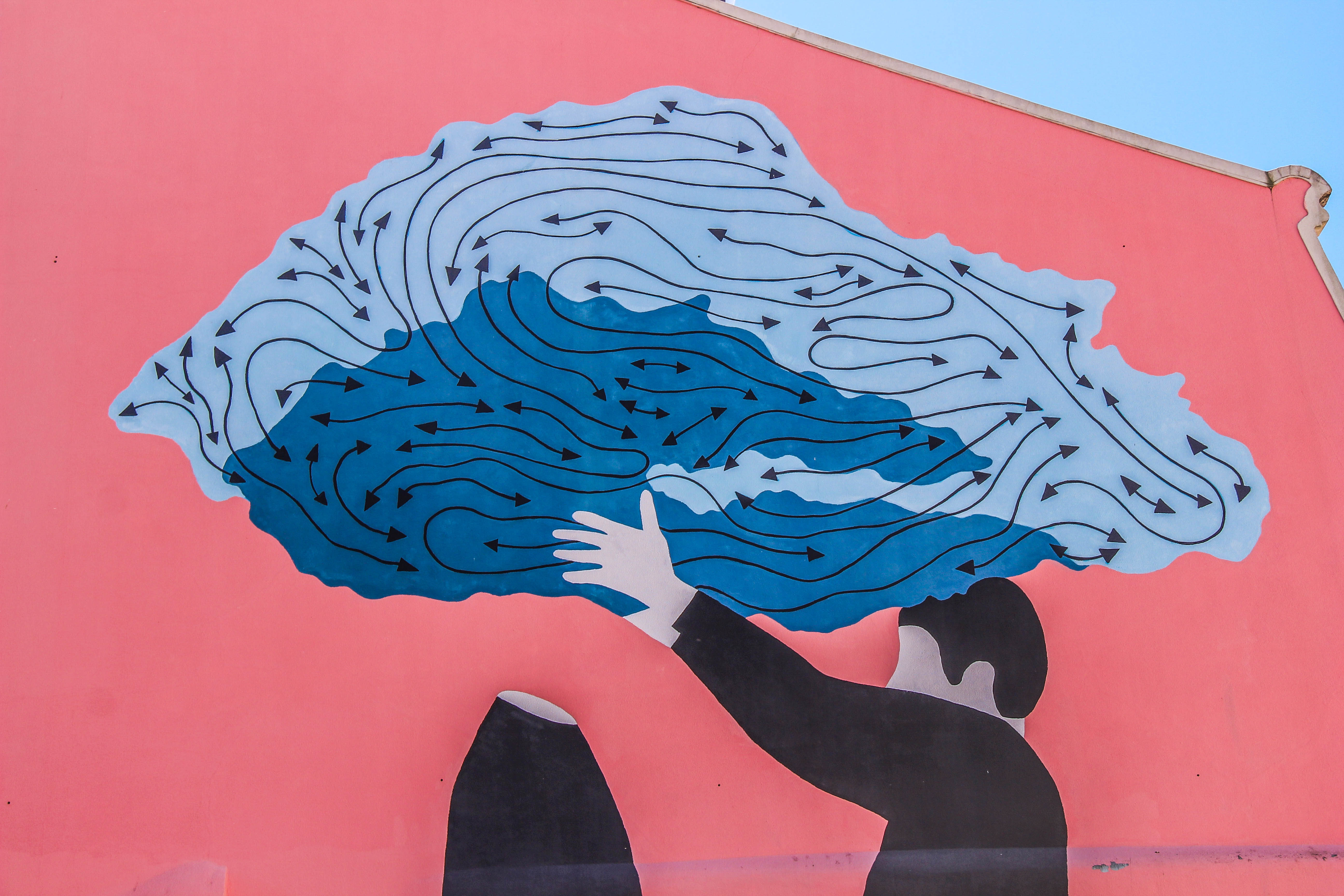 Na próxima rotunda encontramos as cores fortes e os traços simples da brasileira Muzai nas paredes de uma escola.