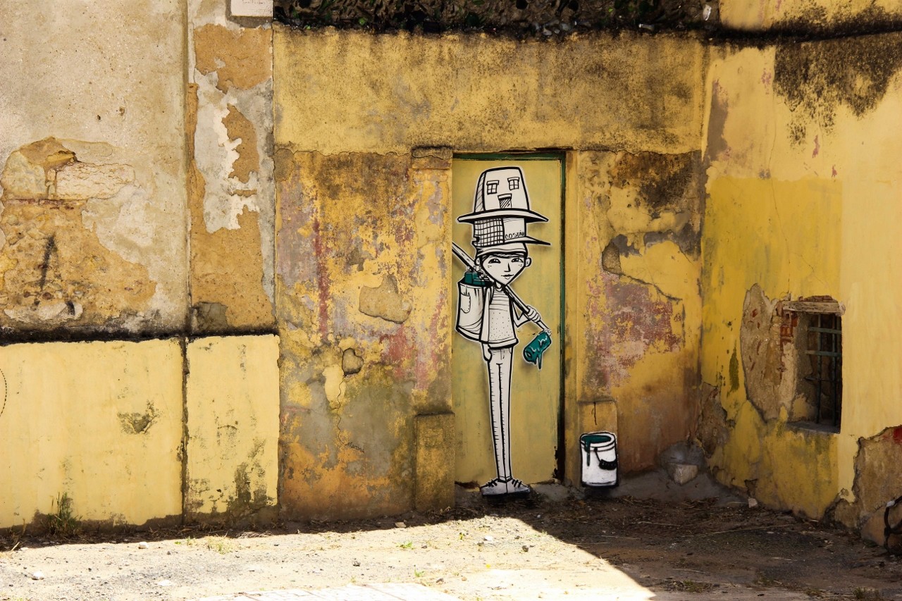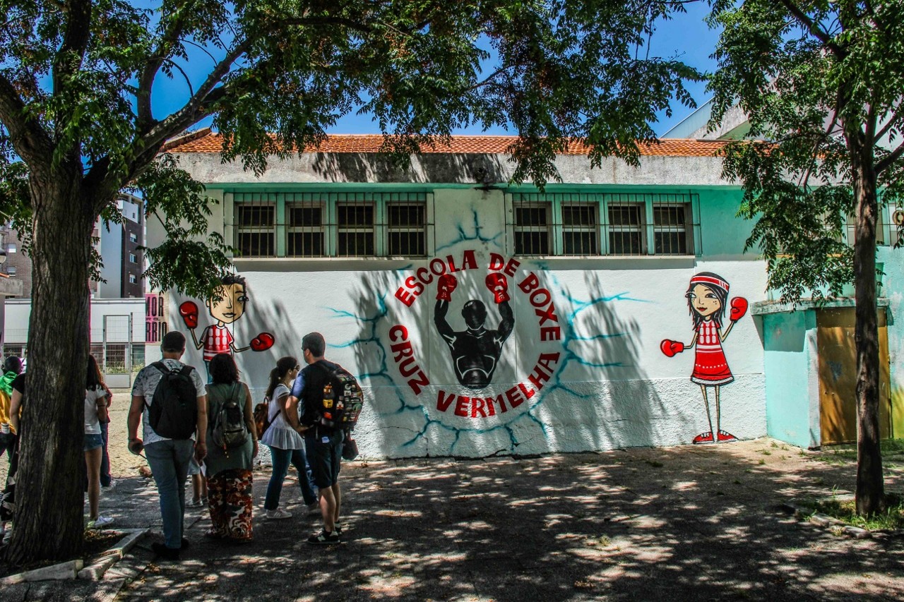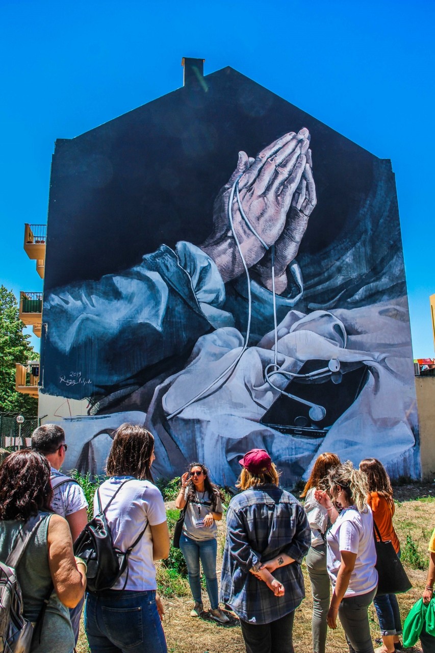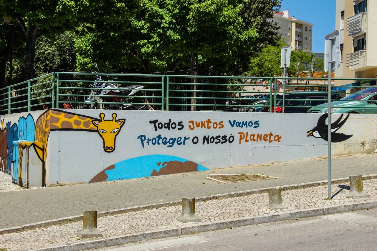 Ainda em ambiente escolar, o colectivo italiano NSN997 (Nuovo Stile Napoletano) promove o seu "Padrão Positivo" e a prática de boas maneiras. Ao lado, um mural pintado por crianças alerta para a necessidade de proteger o planeta.