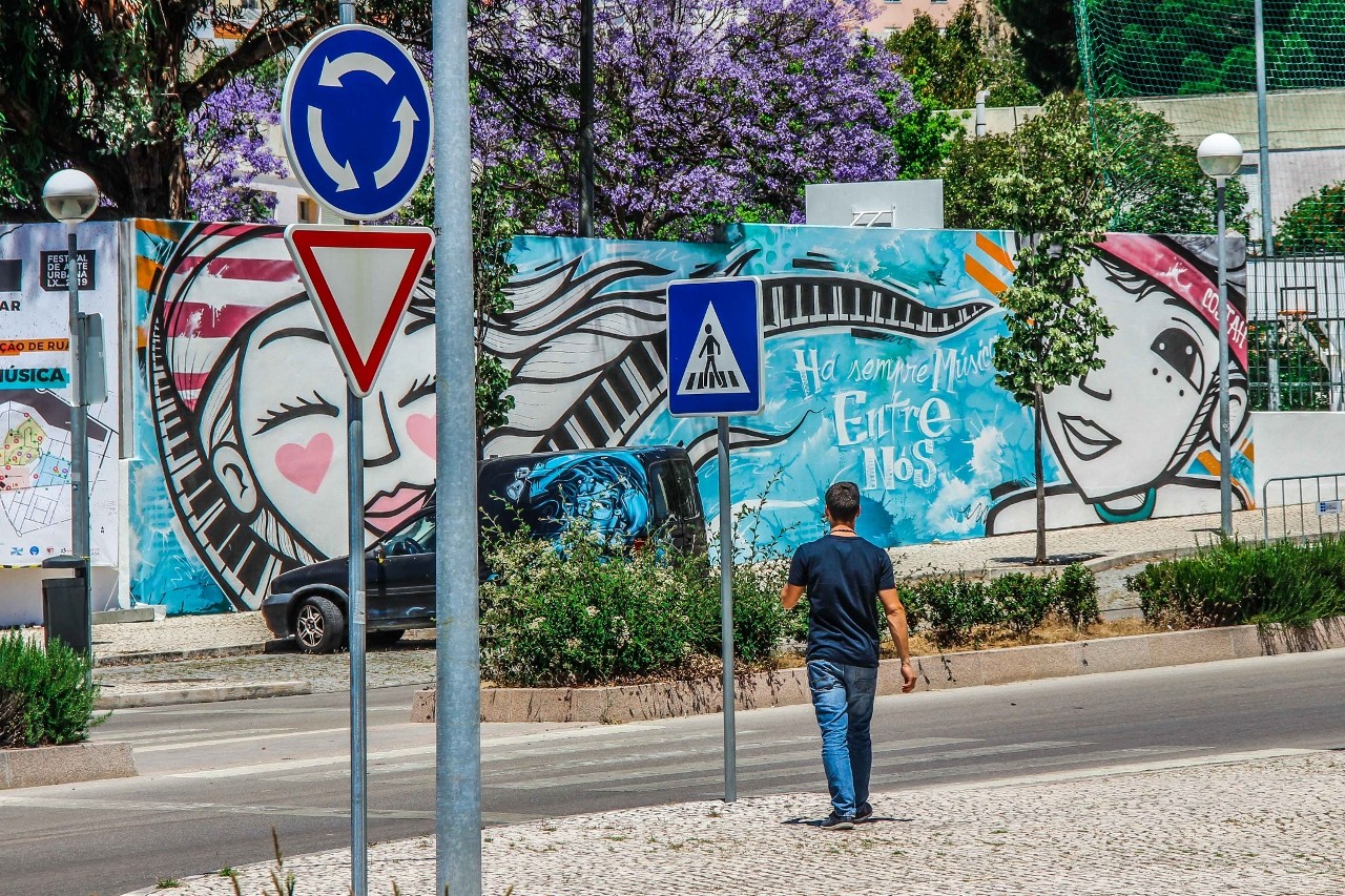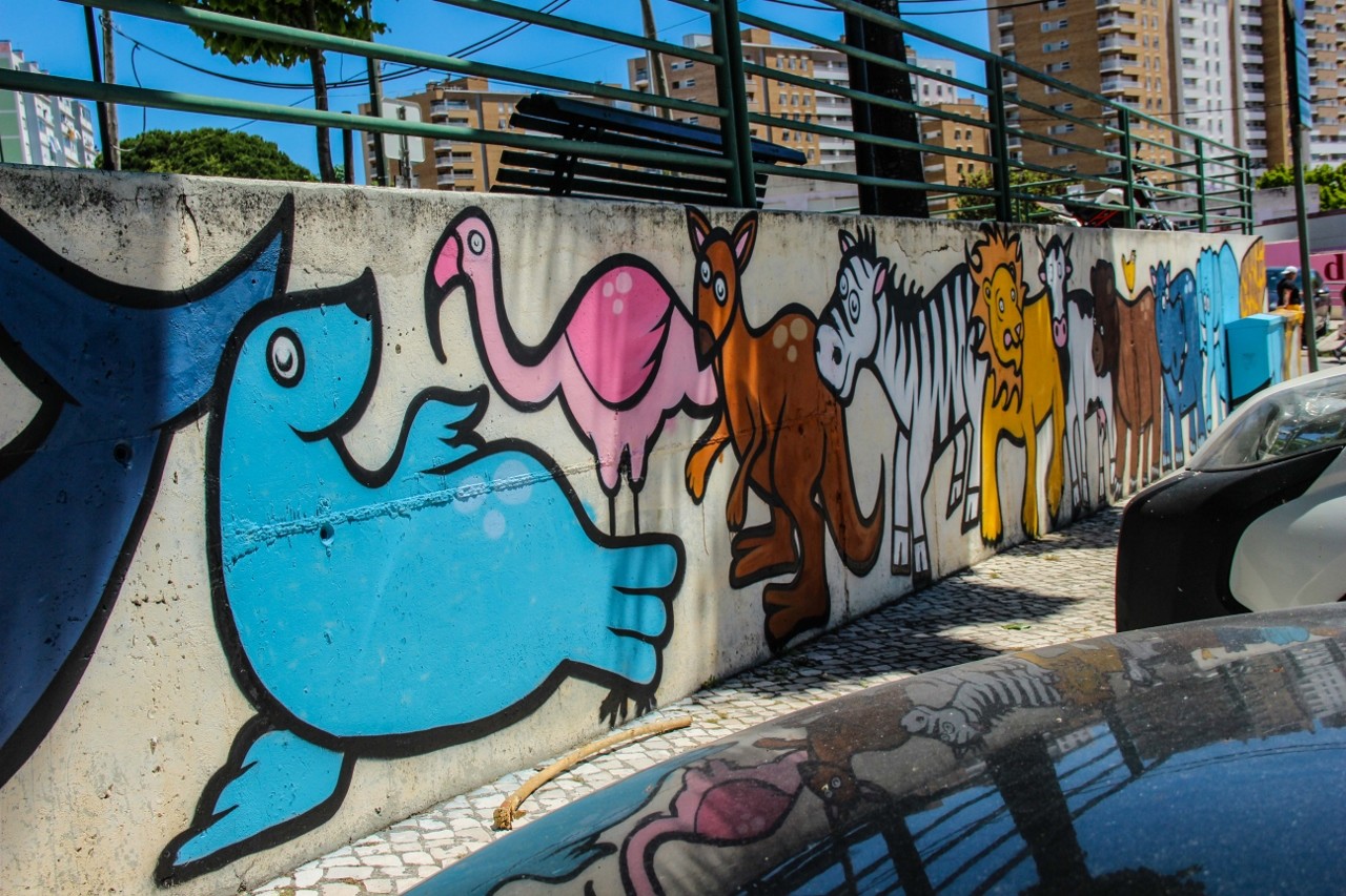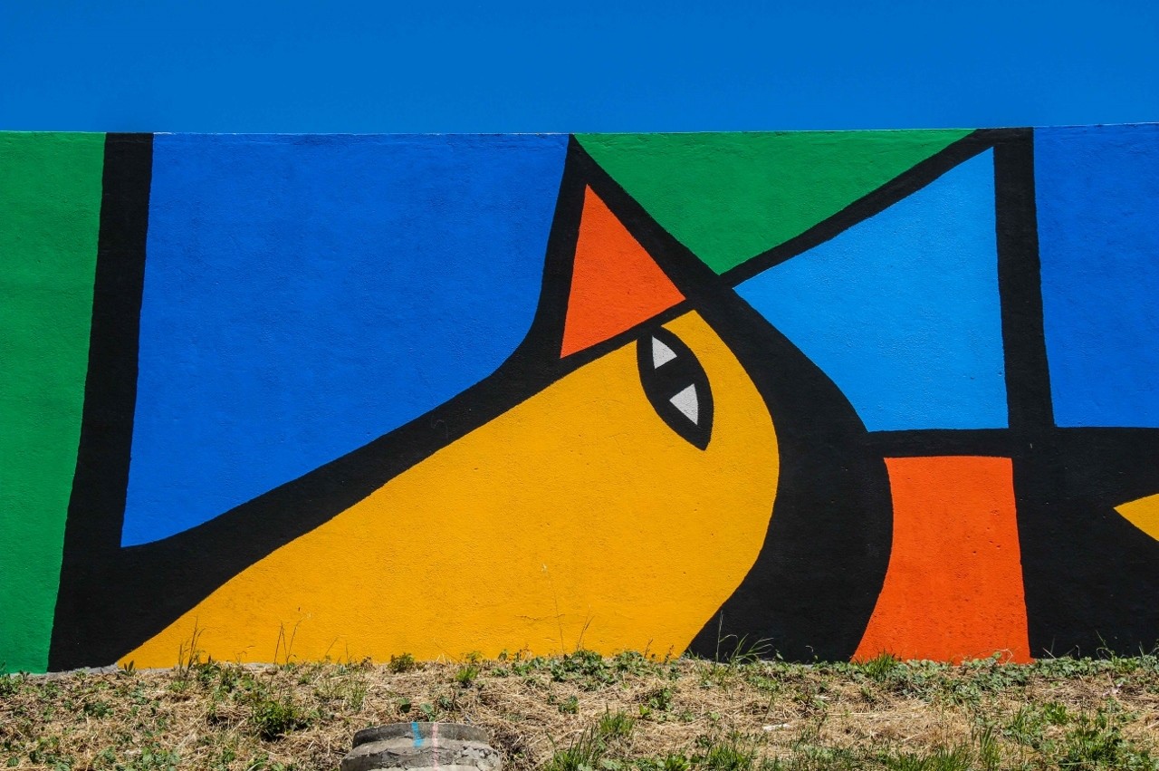 Na próxima rotunda encontramos as cores fortes e os traços simples da brasileira Muzai nas paredes de uma escola.